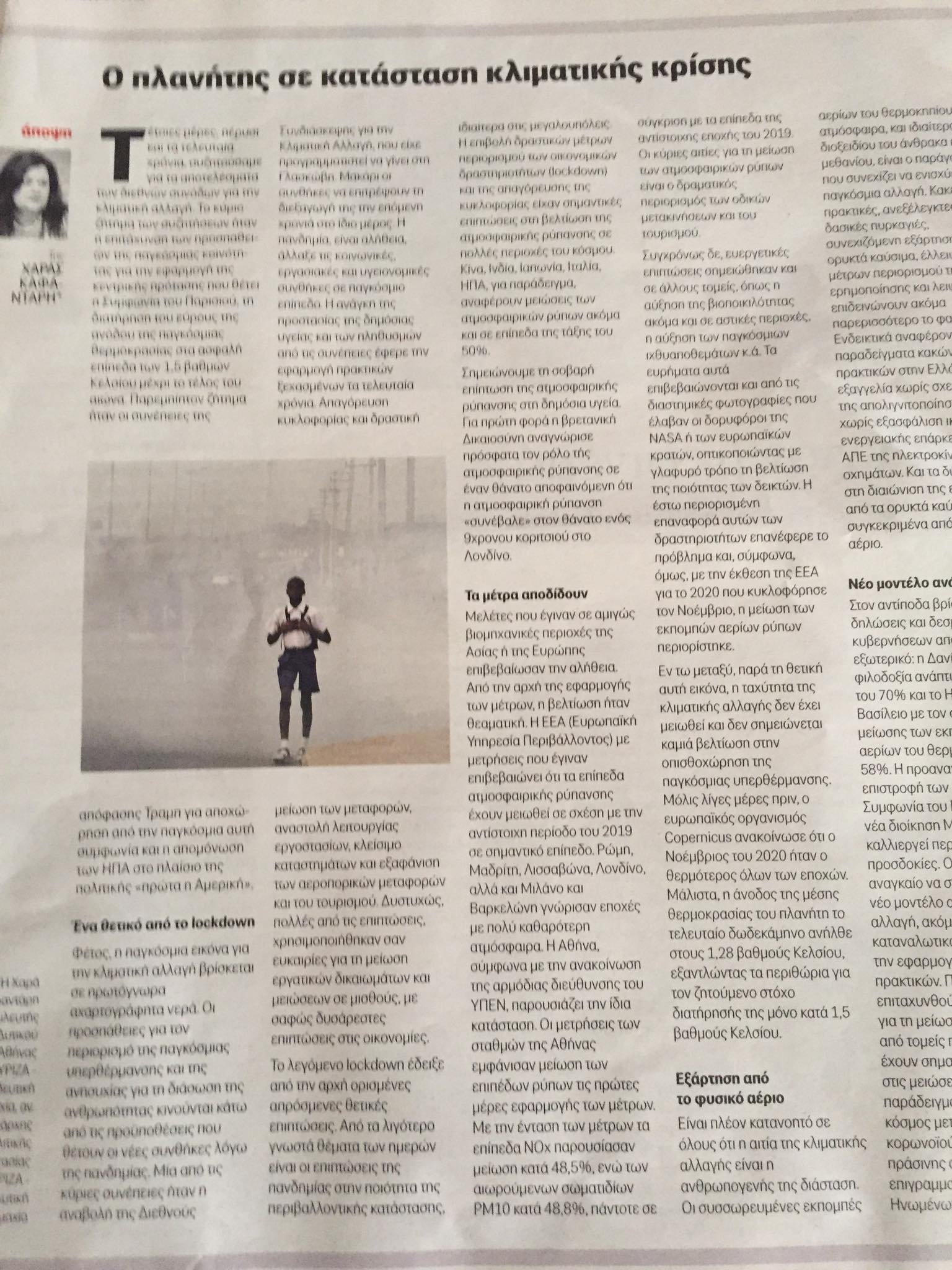 Φέτος, η παγκόσμια εικόνα για την κλιματική αλλαγή, βρίσκεται σε πρωτόγνωρα αχαρτογράφητα νερά. Οι προσπάθειες για τον περιορισμό της παγκόσμιας υπερθέρμανσης και της ανησυχίας για την διάσωση της ανθρωπότητας κινούνται κάτω από τις προϋποθέσεις που θέτουν οι νέες συνθήκες, λόγω της πανδημίας. Μια από τις κύριες συνέπειες ήταν η αναβολή της Διεθνούς Συνδιάσκεψης για την Κλιματική Αλλαγή, που είχε προγραμματιστεί να γίνει στην Γλασκώβη. Μακάρι, οι συνθήκες να επιτρέψουν την διεξαγωγή της, την επόμενη χρονιά, στο ίδιο μέρος. Η πανδημία, είναι αλήθεια, άλλαξε τις κοινωνικές, εργασιακές και υγειονομικές συνθήκες σε παγκόσμιο επίπεδο. Η ανάγκη της προστασίας της δημόσιας υγείας και των πληθυσμών από τις συνέπειες έφερε την εφαρμογή πρακτικών, ξεχασμένων τα τελευταία χρόνια. Απαγόρευση κυκλοφορίας και δραστική μείωση των μεταφορών, αναστολή λειτουργίας εργοστασίων, κλείσιμο καταστημάτων και εξαφάνιση αεροπορικών μεταφορών και του τουρισμού. Δυστυχώς, πολλές από τις επιπτώσεις, χρησιμοποιήθηκαν σαν ευκαιρίες για την μείωση εργατικών δικαιωμάτων και μειώσεων σε μισθούς, με σαφώς δυσάρεστες επιπτώσεις στις οικονομίες. Το λεγόμενο lockdown έδειξε από την αρχή ορισμένες, απρόσμενες θετικές επιπτώσεις. Από τα λιγότερο γνωστά θέματα των ημερών είναι οι επιπτώσεις της πανδημίας στην ποιότητα της περιβαλλοντικής κατάστασης, ιδιαίτερα στις μεγαλουπόλεις. Η επιβολή δραστικών μέτρων περιορισμού των οικονομικών δραστηριοτήτων (lockdown) και της απαγόρευσης της κυκλοφορίας είχαν σημαντικές επιπτώσεις στην βελτίωση της ατμοσφαιρικής ρύπανσης σε πολλές περιοχές του κόσμου. Κίνα, Ινδία, Ιαπωνία, Ιταλία, ΗΠΑ, για παράδειγμα, αναφέρουν μειώσεις των ατμοσφαιρικών ρύπων, ακόμα και σε επίπεδα της τάξης του 50%.