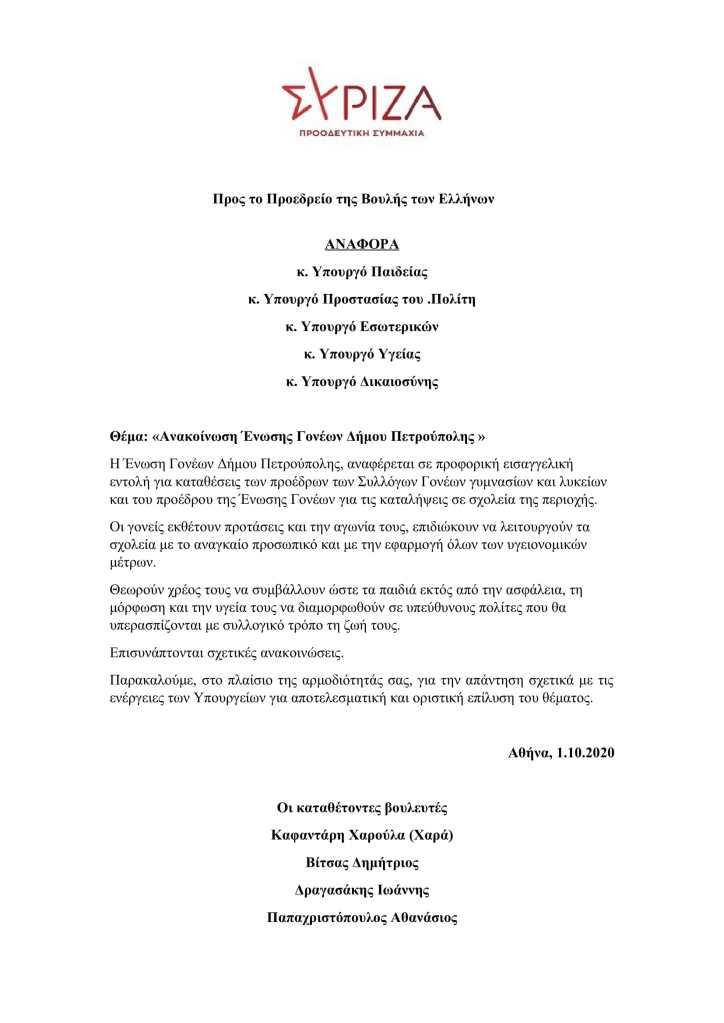 Η Χαρά Καφαντάρη, βουλευτής Β2 Δυτικού Τομέα Αθήνας και ο Παππάς Νικόλαος, βουλευτής Β3 Νότιου Τομέα Αθήνας, καταθέτουν Αναφορά προς τους κ.κ. Υπουργούς Παιδείας & Θρησκευμάτων, Εσωτερικών και Υποδομών & Μεταφορών, την επιστολή της Ένωσης Συλλόγων Γονέων & Κηδεμόνων Δήμου Αιγάλεω προς το Δήμο Αιγάλεω, με θέμα: «Διευθέτηση προβλημάτων σχολείων στον Δήμο Αιγάλεω».